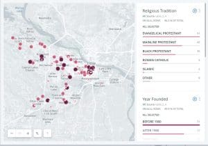 You can click on the “Year Founded” tab to see the history of Little Rock’s growth through the establishment of new places of worship in new areas as the city expanded over time.  The “Majority Race” tab illustrates the clear racial and geographic divisions in our city, as seen in the screenshot of the map below. The purple dots represent congregations with majority white attendees while green dots represent congregations with majority Black attendees.