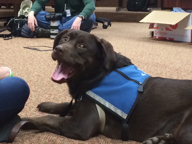 During the event, Laan delivered a brief presentation and the canines demonstrated their expertise. At the conclusion, several toy and treat donation boxes, filled by campus dog enthusiasts prior to the event, were given to the representative from the Paws in Prison program.