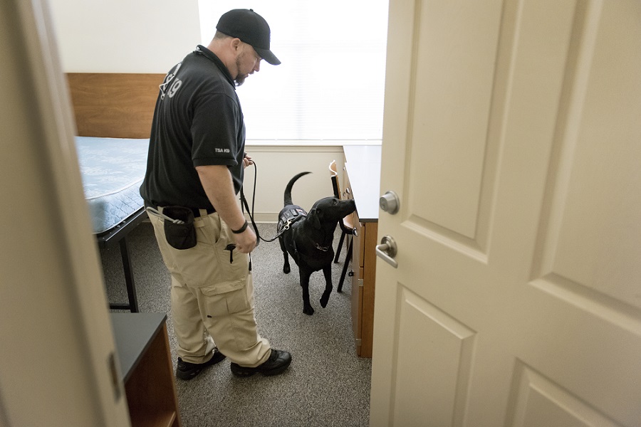Agencies like the police departments for Little Rock, Jonesboro and Dallas, Texas, simulated searching for explosives during a training and certification session at UALR’s South Hall.