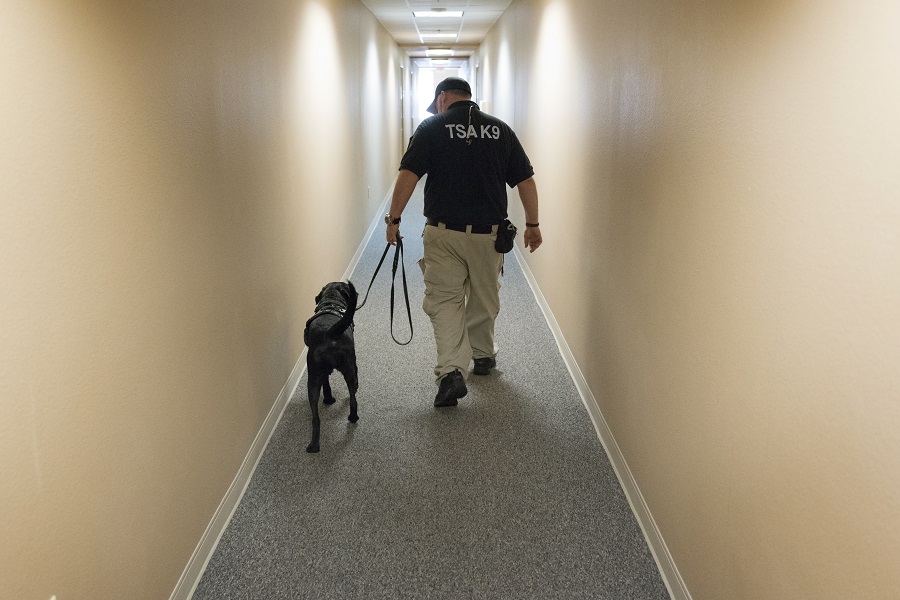 For the exercise, dogs and their handlers practiced clearing an area of simulated explosives within a set amount of time.