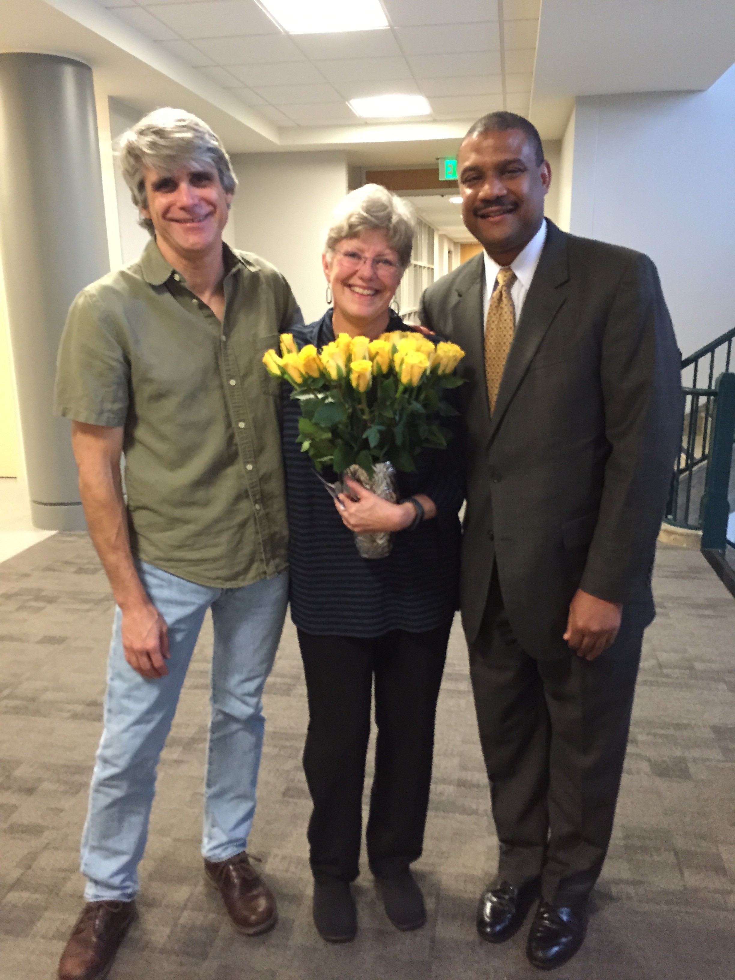 Professor Coleen Barger (center), holds flowers sent by the Association of Legal Writing Directors and the Legal Writing Institute, with two fellow members of Bowen's legal writing faculty: Assistant Professor George Mader (l) and Associate Professor Terrence Cain (r)