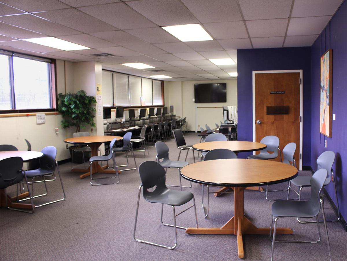 The center has PC and Mac computers, printers, and small tables for group meetings.