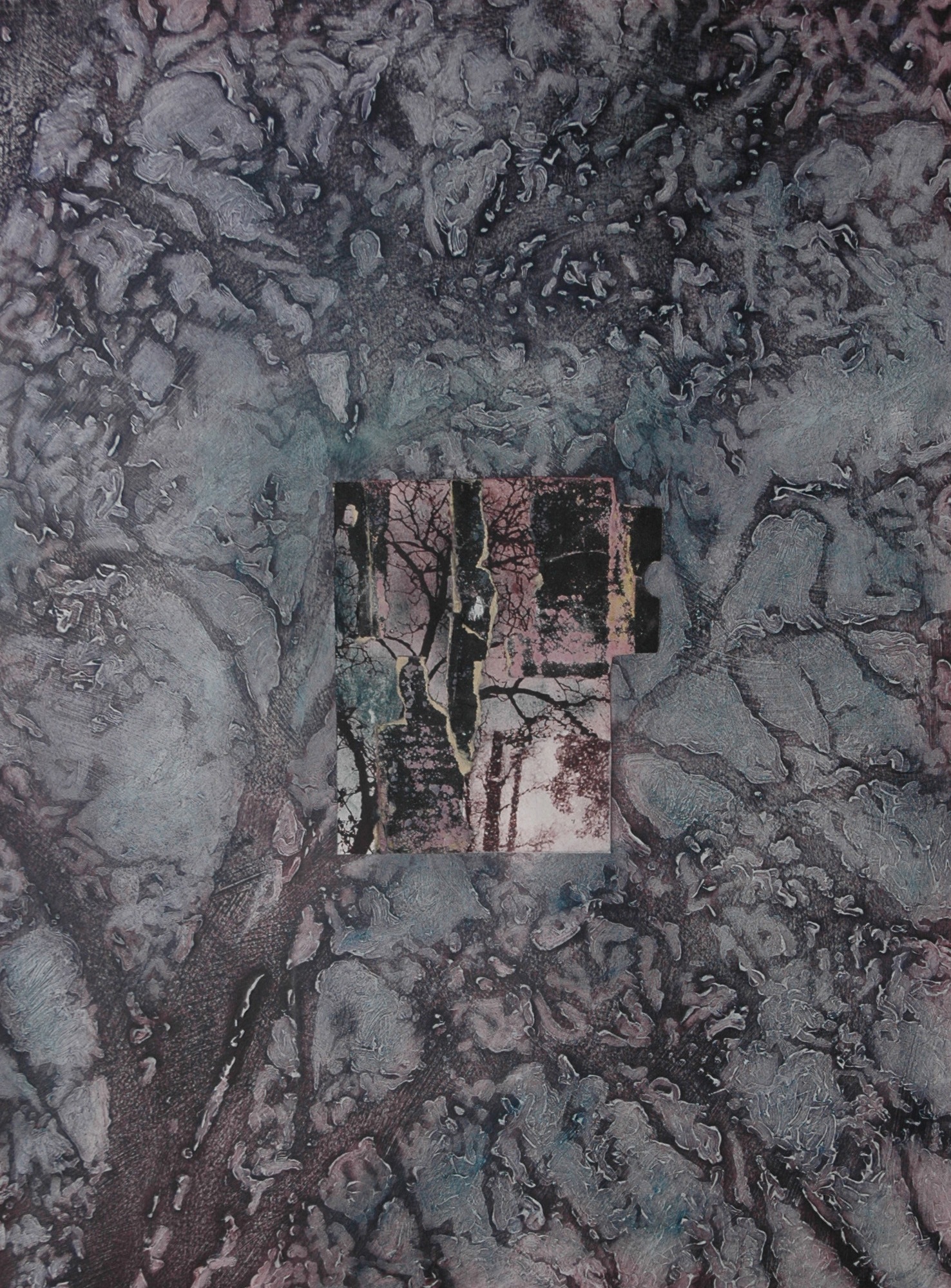 Brad Cushman’s collage, “Shadows in the Water I,” is featured in his art show at Pulaski Technical College.