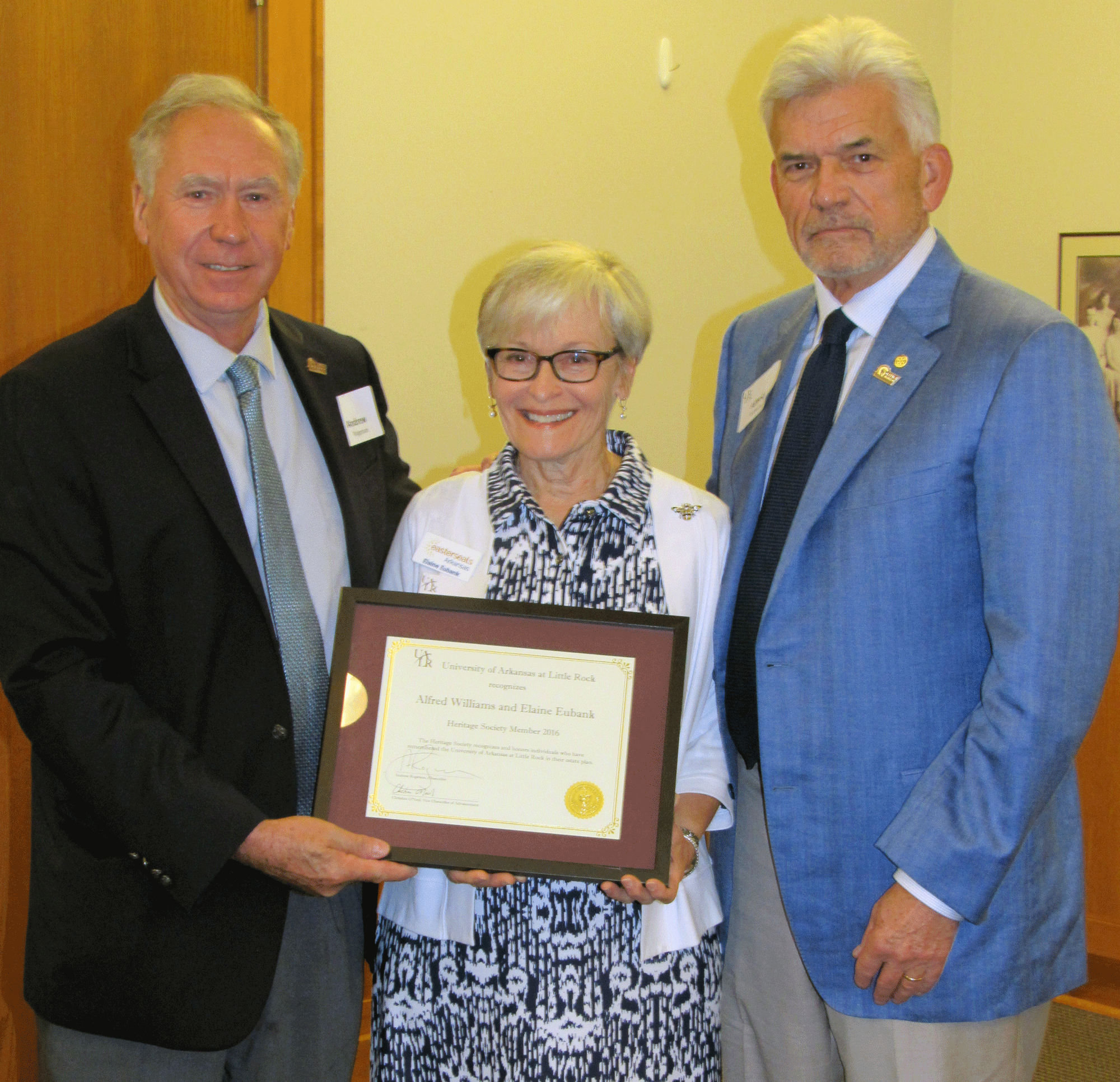 Chancellor Andrew Rogerson (left) presents a plaque to honor new Heritage Society members Elaine Eubank (middle) and Alfred Williams (right).