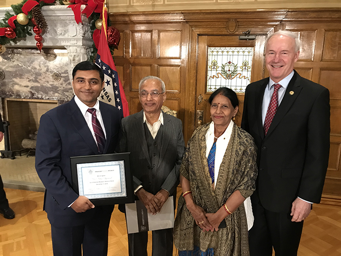 The six new ARA Fellows join existing ARA Scholars and Fellows in the ARA Academy of Scholars and Fellows, now 26 members strong.“ARA Fellows are nominated by their respective institutions,” said Jerry Adams, ARA president and chief executive officer. “We are honored to have these immensely talented researchers join the ARA Academy of Scholars and Fellows.”In the top right photo, Dr. Nitin Agarwal and his parents are pictured with Arkansas Gov. Asa Hutchinson.