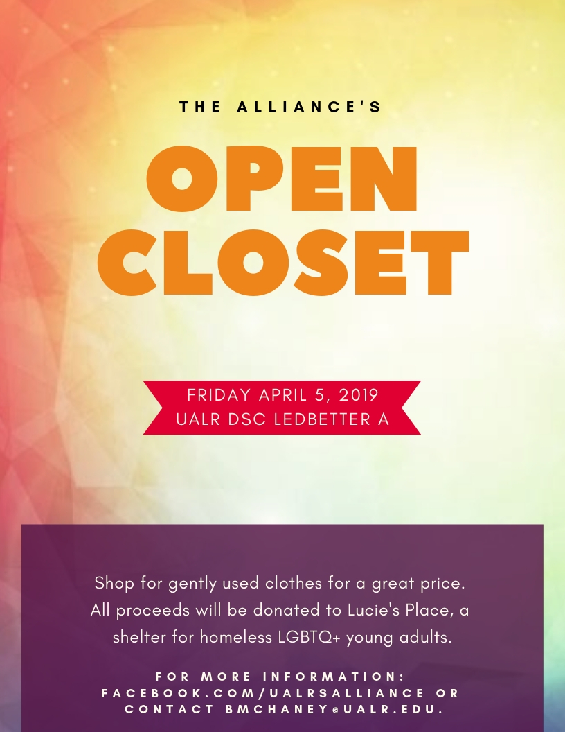 UA Little Rock’s Alliance, in partnership with AWARE, will host an “Open Closet” fundraiser on Friday, April 5, from 11 a.m. to 3 p.m. in the Donaghey Student Center Ledbetter A. All funds raised will benefit Lucie’s Place, the only homeless shelter for LGBTQ+ youth in Arkansas.The fundraiser will allow participants to shop for gently used clothes at discounted prices.. Clothing of all types and sizes will be available, and the event is gender non-binary and transgender-friendly.If you are interested in donating clothes, contact the Alliance or AWARE on Facebook or look for marked donation bins on the first floor of Ottenheimer Library and around campus. Only gently used clothes in good condition will be accepted.For more information about the Alliance at UA Little Rock, visit the Facebook page. For more information about AWARE, visit the page.