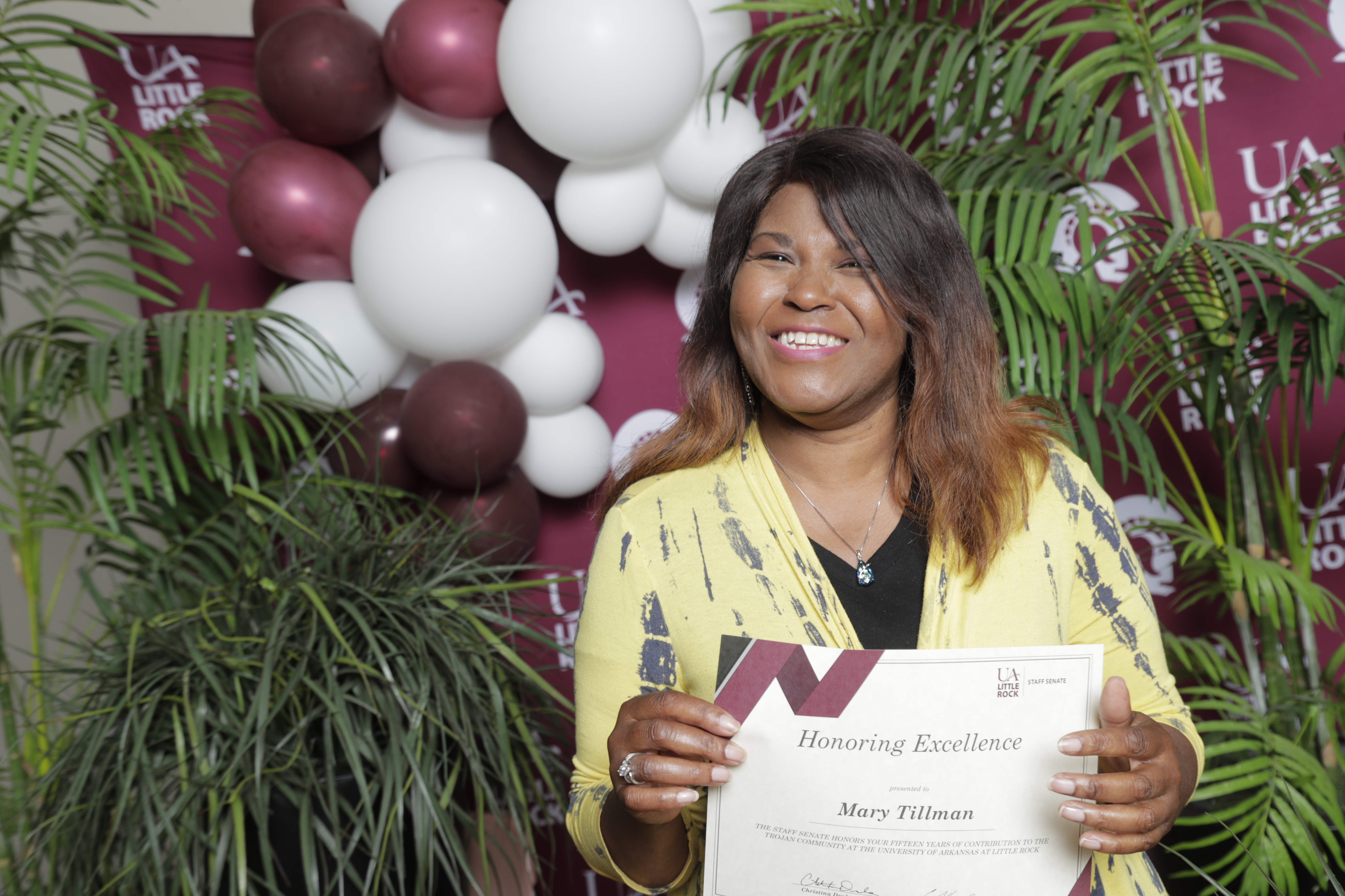 Evonne Hair attends a staff recognition event.Evonne Hair, a student program coordinator for the Jodie Mahony Center for Gifted Education, will always remember 2020 as a milestone in her life. Last December, she graduated from UA Little Rock with a bachelor’s degree in applied communication after taking college classes for 16 years.“It was a milestone for me to complete my bachelor’s degree,” Hair said. “I’m the second out of six kids to graduate. I couldn’t celebrate my graduation last year because of COVID but I’m celebrating now.”Having started her college education at UA Little Rock in 2004, Hair said she had exhausted financial aid options and had been paying for her education while working full-time at the university for years.Hair is one of five UA Little Rock staff members who received the Staff Senate Scholarship in 2020, and the money helped pay for her final semester of college at UA Little Rock. However, it was one final act of kindness that got her over the home stretch.“UA Little Rock has been a great help during this time,” Hair said. “Dr. April Chatham-Carpenter and Steve McClellan, God rest his soul, gave me the last $1,500 I needed to finish. That’s the reason I was able to get my degree.”