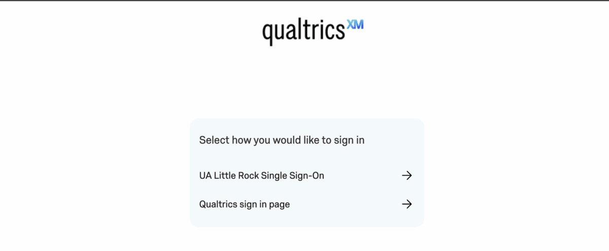 Faculty with access to the QClassroom dashboard can visit ualrevaluations.qualtrics.com, where evaluation results can be compiled by course and term. On the sign-in landing page, select the ‘UA Little Rock Single Sign-On’ option to log in to the account that’s been set up for access to the dashboards.