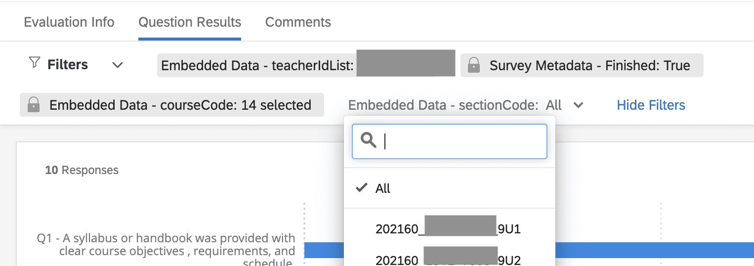 The default display on these pages will show aggregate response data for all courses associated with the user. At the top of these pages is a filter labeled ‘Embedded Data – Section Code’ — select one or more courses from the list to display the results specific to the selection.