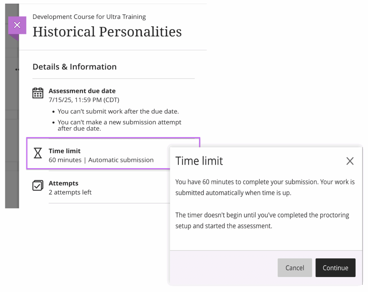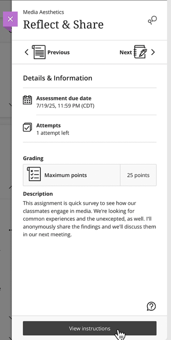 Assignments with a time limit will display the amount of time you have to submit on the Details & Information panel. The timer will begin counting down when you click the ‘Start Attempt’ button, so be sure you’re ready to submit. If no time limit is listed, you can click the ‘View Instructions’ button without penalty until the listed due date.