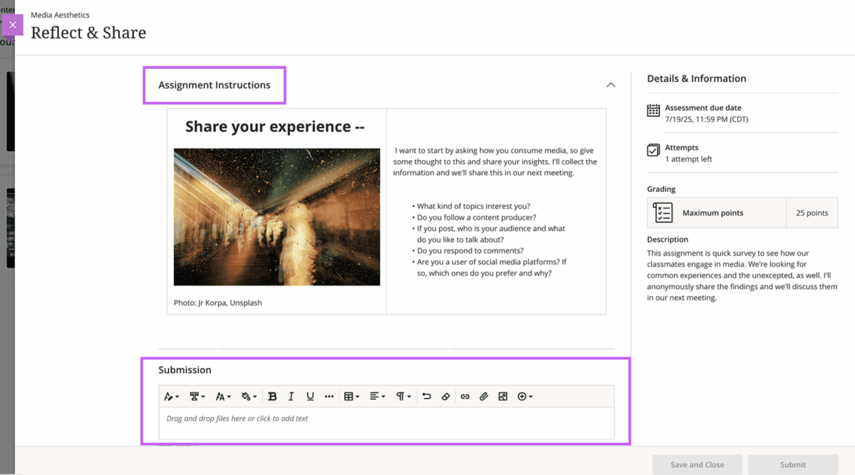 - Grading and Description: Grading displays the maximum points possible, along with a rubric, and a description about the assignment may be included.
