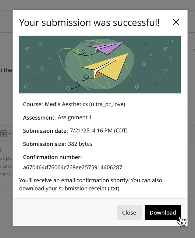 Upon submission of your assignment, a submission receipt displays with the option to download a text file for your records. In addition, an email will be sent to your UA Little Rock email account.