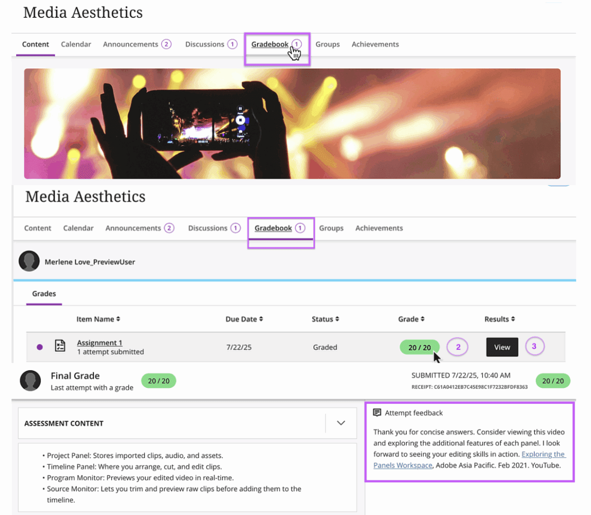 Once your instructor has graded your submission, you should be able to view the assigned score and any feedback provided through the assignment tool by clicking the ‘Gradebook’ tab at the top of the course.