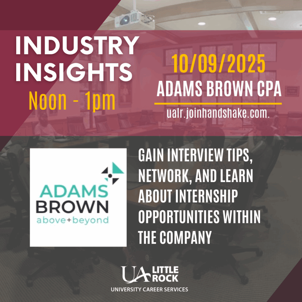 Gain interview tips, network, and learn about internship opportunities available with Adams Brown CPA for Career Services’ Industry Insights event on 10/9/2025.