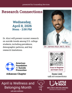 Dr. James Aluri will present current research on suicide trends among U.S. college students, including prevalence, demographic patterns, and key research limitations. Access the Zoom webinar.