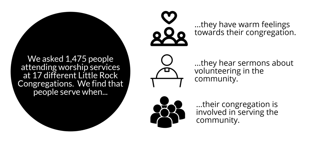Second, and more interesting to us as social scientists, we found that people who heard sermons about volunteering in the community were more likely to serve at their own place of worship. Importantly, these are not sermons urging members to help set up for the fish fry. These are sermons urging them to go out and serve in the broader community. It turns out that those kinds of messages also lead people to serve their own congregations.