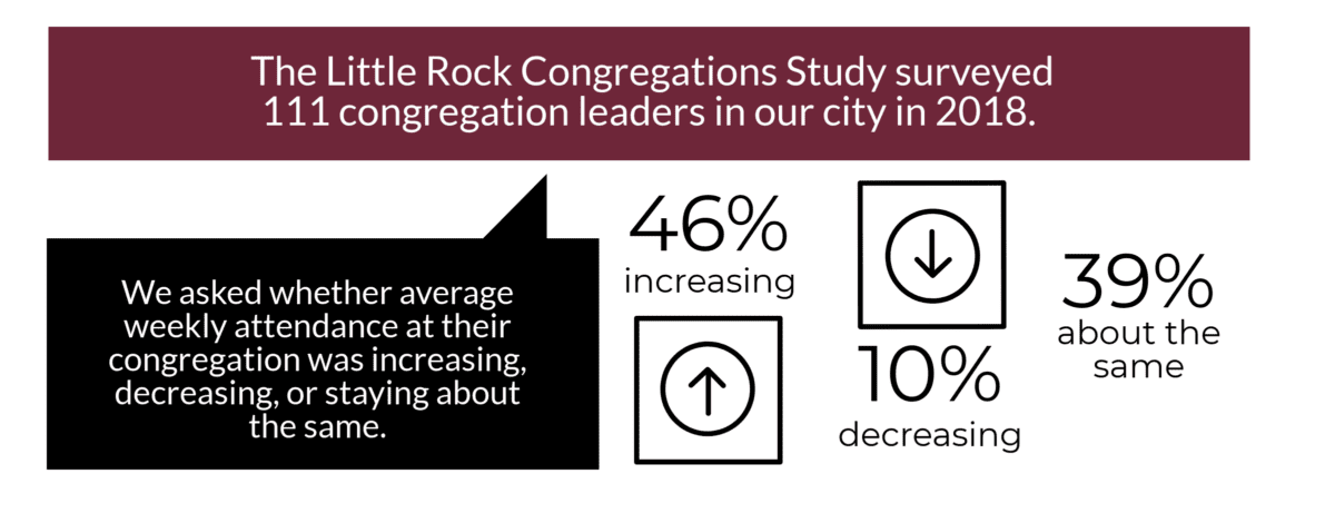 Whether their congregation is a few dozen or a few thousand, every congregation leader would like to see worship service attendance grow. In 2018, the Little Rock Congregations Study surveyed 111 congregation leaders from diverse religious traditions across Little Rock. We asked them whether, in the past two years, they had seen their average weekly attendance increase, decrease, or remain the same. About 46% of responding congregations reported that their attendance is up, while about 39% said that it is about the same. Only 10% of congregation leaders reported a decline in attendance. For those readers questioning the self-reports of clergy, these data look to be about on par with national trends, which show about a 3% decline in weekly church attendance from 2007 to 2014 (http://www.pewforum.org/religious-landscape-study/attendance-at-religious-services/).
