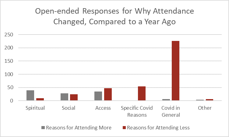 - The Covid-19 pandemic was the most common reason provided for why respondents had changed their attendance behavior. Some people are attending more because the pandemic has sparked a greater need for spiritual connection, but many more people are attending less because the pandemic has reduced service times, made in-person services more difficult, or made online services the only option, which some find less appealing.