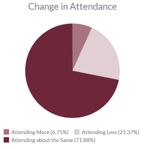 - The Covid-19 pandemic had a major impact on worship service attendance. Most of the respondents are attending worship services about as often as they were a year ago (before the Covid-19 pandemic), but 21% say that they are attending less often and nearly 7% say that they are attending more often.