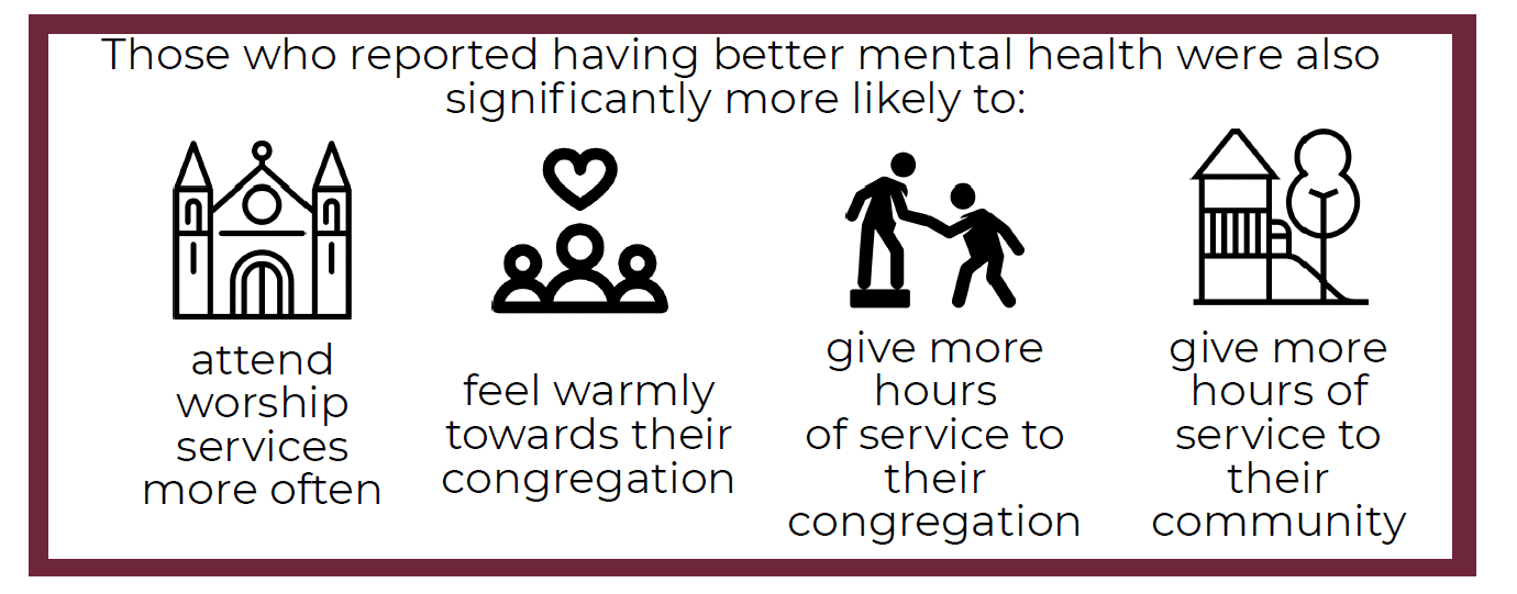 - Having a close connection with a worship community and providing service is associated with better mental health. Those with better mental health also attend worship services more often, have warmer feelings about their congregation, give more hours of service to their community, and give more hours of service to their congregation. It is important to note that in conducting these analyses, we are only able to make a correlation between positive mental health and these other behaviors; we don’t know for certain which way causation runs. We do know from other research, however, that participating in a religious community and giving service tends to support good mental health.