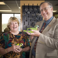 Jeff Gaffney, chair of UALR’s Department of Chemistry and his wife and co-researcher, Nancy Marley, share their home with 10 exotic and colorful birds — an umbrella cockatoo named Angel, a pair of African grey