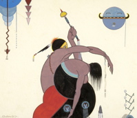 Selected from the J.W. Wiggins Collection, the exhibition features works by Oklahoma artists working in what is known as the studio or flat style, the style generally thought of as traditional Indian painting. Pieces by artists Woody Crumbo, Archie Blackowl, Saul Terry, Albin Jake, Fred Beaver, and others are included in the exhibition.