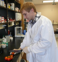 UALR junior Ryne Ramaker of Bentonville launches a new research project this semester aimed at developing an efficient method for determining antioxidant properties of tomato varieties. His work with Dr. Stephen C. Grace, associate professor of biology – “Evaluation of antioxidant phytonutrient composition in tomato varieties of commercial importance to Arkansas” – is being funded by a grant of the Arkansas Student Undergraduate Research Fellowship (SURF).