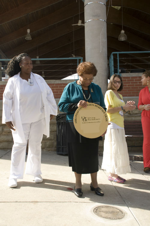 Dr. Edith Irby Jones, the first African American graduate of UAMS receives a medallion, a replica of her marker on the Arkansas Civil Rights Heritage Trail.