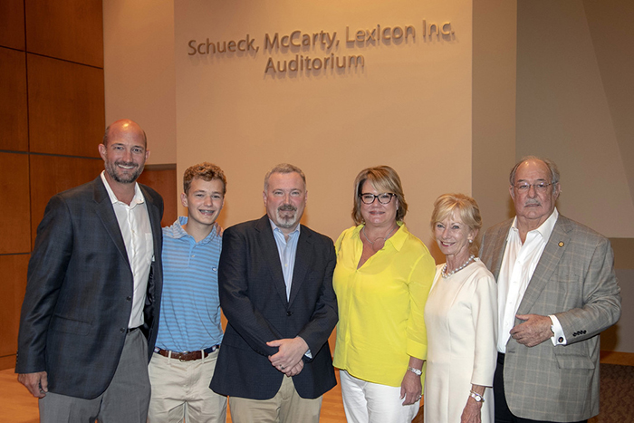 Thomas Schueck, a Little Rock business owner who went to college at night to obtain his engineering degree, built his steel company from the ground up in the late 1960s. Fifty years later, Schueck’s name became a permanent fixture in the University of Arkansas at Little Rock’s Donaghey College of Engineering and Information Technology (EIT). During a dedication ceremony on Sept. 11, the EIT auditorium officially became the “Schueck, McCarty, Lexicon Inc. Auditorium” in recognition of his family’s contributions to the college. Schueck, founder and chairman of Lexicon, contributed $1 million to the college in 2008 when asked to help boost the university’s engineering and information technology programs.“We thought it would be a good cause, and we thought the graduates of the university might stick around Little Rock and maybe work for us,” Schueck said. “Fast forward 10 years, and we now employ five graduates of the program.”Over the past decade, Schueck’s original gift of $1 million has grown to more than $1.5 million, and funds have been used to assist every student in the college.“Funds from this gift have supported state-of-the art technology in this college, making it possible for our students to access learning applications 24-7,” said Chancellor Andrew Rogerson. “As you know, leading technology is a must in a college that prepares our future engineers and information scientists and technicians.”The EIT student lab features whiteboards, dozens of computers, and laptop space and is one of the most advanced labs on campus. More than 1,200 students each year benefit from access to technology applications and computer licensed programs.“Because of their commitment to the UA Little Rock Donaghey College of Engineering and Information Technology, we can ensure academic excellence for every one of our students,” said Christian O’Neal, vice chancellor for advancement. “It is vital in today’s society that we continue to progress as a university, and we can only do that through the generous philanthropic efforts like that of Tom Schueck.”The Schuecks, along with their son Patrick, daughter Jennifer McCarty and her husband, Mark, and the McCartys’ son, Harrison, were present when the new signage in the auditorium was unveiled, which Schueck called “a humbling experience.”“It is a great honor to have our names attached to this auditorium, and we are proud that our family is assisting many students with some support of their financial needs,” he said.Special guests included Sen. and Mrs. David Pryor; former Gov. Jim Guy Tucker; Greg Flesher, chair of the Donaghey Foundation Board of Directors; Larry Whitman, dean of the College of Engineering and Information Technology; Dr. Michael Moore, vice chancellor for academic affairs for the University of Arkansas System; and Janessa and Dr. Rogerson.Gov. Asa Hutchinson could not attend the event but offered remarks in a pre-recorded video shown at the event. The governor congratulated the Schuecks for the success of their business which started in 1968 in a garage and now employs more than 1,300 employees.“The company has played a major role in construction projects across the state and nation,” he said.Schueck, a Saint Louis native, worked for a local construction company after high school. He took night classes and graduated with a civil engineering degree from Washington University in 1965.He and his wife moved to Little Rock and founded Schueck Steel Products, which quickly grew and is now under the umbrella of Lexicon Inc. Lexicon’s construction division (formerly known as Schueck Steel) specializes in structural steel erection, mechanical equipment installation, construction management, and plant maintenance. Prospect Steel specializes in structural steel fabrication and erection. Custom Metals specializes in plate and sheet metal fabrication, installation, and maintenance. Heritage Links specializes in golf course construction.Photos by Benjamin KrainTop Right: Thomas Schueck, center left, is joined by his family as his grandson, Harrison McCarty, unveils a new sign during a dedication ceremony renaming the auditorium in the EIT building to the Schueck, McCarty, Lexicon Inc. Auditorium. Above Middle: Thomas Schueck and his family were honored Sept. 11, 2018, during a dedication and naming of the College of Engineering and Information Technology auditorium as the “Schueck, McCarty, Lexicon Inc. Auditorium.” From left Patrick Schueck, Harrison McCarty, Mark McCarty, Jennifer McCarty, and Marge and Tom Schueck.