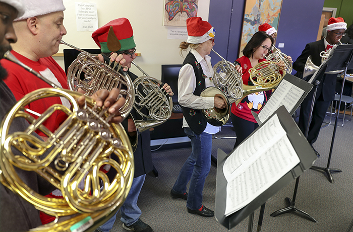 Photo by BENJAMIN KRAIN --12/3/18--.UA Little Rock music students dressed in holiday attire serenade campus offices while Christmas caroling as the French HornamentsUniversity of Arkansas at Little Rock Director of Bands Ken Goff and the French horn section spread a little holiday cheer on Monday, Dec. 4, while performing short mini concerts at various campus locations.The ensemble played carols from 11 a.m.-1 p.m. at eight campus sites where they had been invited to perform. The group performed first for Chancellor Andrew Rogerson and then proceeded across campus to the Office of Communications and Marketing where they play traditional carols such as “Up on the Rooftop” and “Jingle Bells.”The ensemble also visited the Department of Speech Communication, the College of Social Sciences and Communications dean’s office, School of Social Work, the Engineering and Information Technology (EIT) dean’s office, the student lounge in the old Fine Arts Building, the dean’s office in the College of Arts, Letters, and Sciences, and the Food Court in the Donaghey Student CenterThe musicians included Dr. Goff and UA Little Rock students Emma Chambers, Kominisha Copeland, Julie Defoor, Neco Larimore, Nell Matthews, and Damion Snowden.