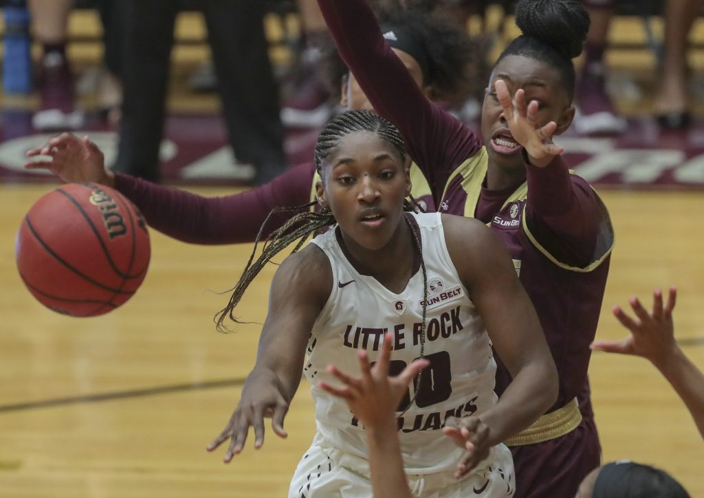 UA Little Rock forward Raeyana DeGray is surrounded by Texas State defenders during the Trojan’s game at the Jack Stephens Center. Photo by Benjamin Krain.