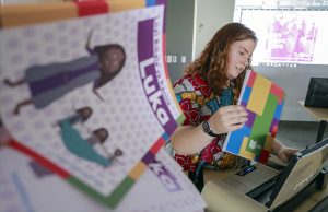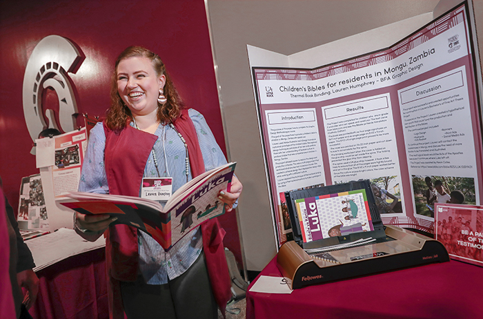 Lauren Humphrey presents at the 2019 Student Research and Creative Works Expo. Photo by Ben Krain.Lauren Humphrey came to UA Little Rock on a Chancellor’s Leadership Corps scholarship to study graphic design. During her time on campus, she discovered another passion: a desire to work in ministry.“I felt called, but not specifically,” she said. “I know that I want to go into ministry, and I would love to do international missions. I always say I’d pack up now and leave if I could.”Humphrey, 22, of Fort Smith, Arkansas, will graduate on May 11 with a Bachelor of Fine Arts in graphic design, but she won’t be gone from campus too long. She will return this fall to begin a 10-month internship with Chi Alpha Christian Ministry, which hosts weekly worship gatherings, discipleship groups, retreats, and mission trips for UA Little Rock students. Chi Alpha staff are full-time missionaries who disciple students on campus. Humphrey’s internship is through the Assembly of God and will help her earn credentials to be appointed as an Assembly of God minister. Humphrey will work with students and then lead an international mission trip in summer 2020.“After, I will ask the Lord if He will have me to serve in the States or in Africa,” she said.Humphrey fell in love with international mission work on a Chi Alpha mission trip. Each summer, Chi Alpha takes teams of 15 to 20 students to Africa or Asia for a month. Humphrey traveled to Zambia one summer and to Sri Lanka and Thailand another. Upon returning from Asia, she got a tattoo of the world’s continents on her forearm. It’s a visual reminder that “the Lord is reminding me that I’m unlimited, that He is everywhere.”Humphrey’s campus pastor, Cody Griggs, suggested she go on her own for a longer period of time if she was considering full-time international missions.“It was a test of calling – seeing if I could manage a budget, find ministry opportunities, enjoy living among a different culture, and feel a calling from the Lord to go back long term,” she said. “I got a calling to devote my life to ministry. I would love to go back to Africa. It’s my dream, but I want to be in the Lord’s will. I want to be where the Lord would have me.”Last summer, Humphrey spent three months in Zambia, working with two ministries: The Zambia Project, a Christian nonprofit that establishes churches in the region, and Village of Hope, which serves homeless and orphaned children. The Zambia Project also provides medical services, builds water wells, and translates Bibles into other village languages.Humphrey stayed in Mongu, which has a school, a hospital, a center where caretakers learn how to care for malnourished children, and a therapy department that helps children with physical and mental disabilities.“While I was there, I was talking to one of the physical therapists who said it would be really good if they had a Bible for kids,” she said. “The only printed Bible in Mongu is like the King James that uses old English type language that is very hard for children to understand, and it’s not illustrated,” she said. Humphrey heard similar sentiments from other missionaries in the area and decided to use her graphic art skills to create an illustrated Bible for African children. The project was part of her Bachelor of Fine Arts thesis project that she presented in April. Although English is the official language of Zambia, the Lozi dialect is more commonly used in Mongu. Humphrey found an online New International Version of the Lozi Bible which she used. Illustrating the entire Bible would be difficult to accomplish in a year, so she started with the Book of Luke, one of the Gospels in the New Testament. “The book is aimed at the second-grade level,” she said. “Those are kids who can read and want to know more about Jesus, but they also need illustrations and bright colors to stay captivated. With the help of an adult reader, it could also be read to little children, and they would also enjoy the illustrations.”Humphrey selected stories to illustrate and Bible verses to highlight. She needed to test prototypes and experiment with book binding when she learned about UA Little Rock’s Signature Experience Awards program, which provides funding for undergraduate students to work on research or creative works with a professor.With the grant, she purchased a thermal binding machine, paper, and ink. Her finished project was a 72-page, full-color book she displayed at the Student Research and Creative Works Expo on April 18. Her mentor was Kevin Cates, associate professor of graphic design.“These probably won’t be sent to Zambia since it would be much more economical for them to be printed in South Africa,” she said of the publication. However, Humphrey hopes to start a nonprofit called Translation Hope so she can raise funds to pay for Bible printing and distribution. In addition to being a student leader in Chi Alpha, Humphrey has worked on The Forum student newspaper as a designer, section editor, editor, and then executive editor. She also has interned in the Chancellor’s Office. Off campus, she works part-time for the after-school program at Lakewood United Methodist Church in North Little Rock and volunteers with the children and youth ministries at Otter Creek Assembly of God in Little Rock.Humphrey is the daughter of Anthony and Kim Humphrey of Fort Smith.