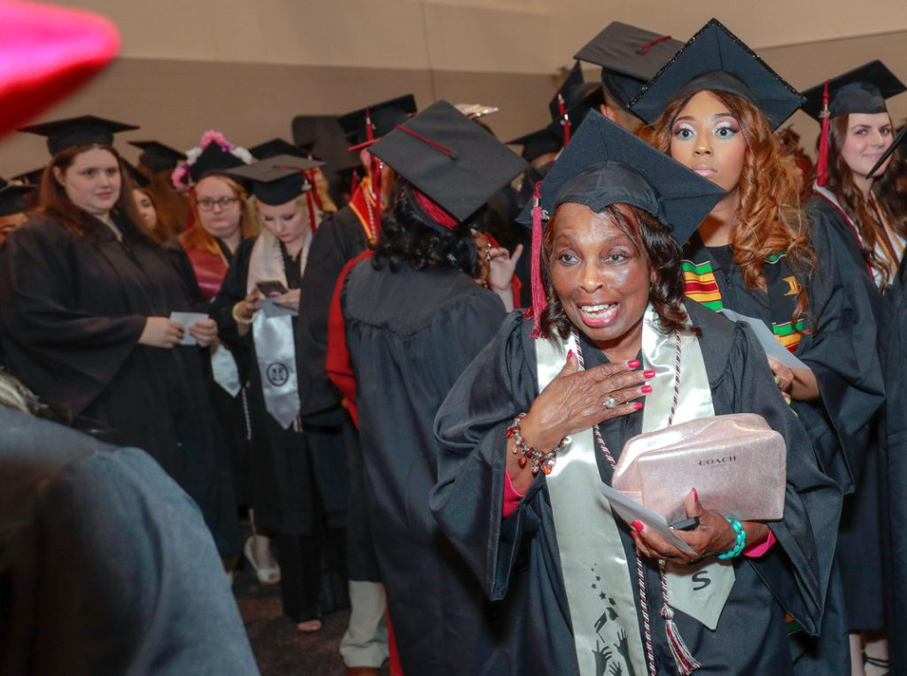 Graduate Vivian Littrell, right, reacts with tears of joy after her niece Chauntee Coleman, left, makes a surprise visit to Littrell;s graduation ceremony at UA Little Rock. Photo by Ben Krain. A University of Arkansas at Little Rock graduate got the surprise of a lifetime when her family from California flew all night to surprise her on graduation day. Vivian Littrell’s May 11 graduation from UA Little Rock with a bachelor’s degree in criminal justice was already a special event, since the 71-year-old grandmother of four and mother of two was finishing her lifelong goal of earning a college degree. “I decided that I wanted to complete my bachelor’s degree before my youngest grandchildren were out of high school,” said Littrell, a first-generation college student from Little Rock. “I’ve been out of college since 1984, when I last attended Philander Smith College. I wanted to major in adult education with a minor in psychology. That was my objective back then, but now many years later, I have a different agenda.”Littrell has always been passionate about helping others and dreamed of being an attorney. She now hopes to use her degree to help minorities navigate the criminal justice system.“I want to volunteer with a nonprofit to help people navigate the criminal justice system who have no idea what is going on,” she said. “So many people are caught up in the criminal justice system that don’t know anything at all about the procedures, and I want to use my knowledge to help them.”As a divorced single mother, Littrell left college 35 years ago to concentrate on providing for her children. She spent her career working in employment training and counseling and as a recruiter for adult education, so Littrell never forgot the importance of a good education and career. Her family has been immensely supportive and gave her a nudge to return to college.“It was my daughter Tyrneese who suggested that I return to college after I had bilateral knee surgery in 2011,” she said. “She told me to find something to do, and a good thing to do would be to return to school and complete my bachelor’s degree.”When Littrell enrolled at UA Little Rock in 2013, she took classes on the Little Rock campus but eventually opted to go online because it was more convenient for her as she cares for her 93-year-old mother. She’s grateful to the many professors and staff members who have helped make her time at UA Little Rock a success.“When I first came, I was nervous. I’m thankful to Ms. Susan Boling, who helped me a lot. She taught me academic literacy,” Littrell said. “I’m also grateful to criminal justice professors Dr. James Hurst and Dr. Timothy Brown and Ms. Karen Wisdom. Most of my instructors were sensitive to the needs of a nontraditional student and worked with me in getting a clear understanding of what was expected of me. Many of my classmates were kind enough to help me with notetaking in class. I also have to give kudos to the entire staff in Student Support Services and the Disability Resource Center.”Littrell is also especially grateful to Dr. Andrew Deiser, interim chair of the Department of World Languages, who helped her pass her foreign language requirement.“I didn’t know anything about a foreign language, and Dr. Deiser tutored me one-on-one himself,” Littrell said. “There are also two young ladies in that division, Bryana Herrera and Autumn Payne, who tutored me as well. Dr. Deiser has helped me more than any other professor at UA Little Rock. He did everything he could to help me pass my Spanish course. Without him, I wouldn’t have graduated. I also wouldn’t have graduated without the help of my department chair, Dr. Mary Parker, or Reed Claiborne from the Disability Resource Center. ”Since Mother’s Day was the day after graduation, Littrell’s son Corey planned a brunch on Saturday where family members from Bryant, Dumas, Hot Springs, and Little Rock were planning to visit. Littrell, an inquisitive woman who loves a good mystery, had suspicions that her son was keeping a secret.