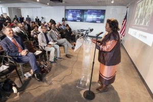 Decendents of some of the 12 defendants in the 1919 Elaine Massacre are honored during an Arkansas Civil Rights Heritage Trail Induction Ceremony. Markers bearing the names of the 12 victims killed in the Elaine race riots were unveiled along the Civil Rights Heritage Trail in downtown Little Rock. Photo by Ben Krain.This year marks the 100th anniversary of the Elaine Massacre, the deadliest racial conflict in Arkansas history, but the scars of the tragedy still follow the family members of the victims generations later.Shelia Walker, who lives in Delaware, always knew her family held a closely guarded secret. Her great-uncle, Albert Giles, was a member of the Elaine 12, a dozen black sharecroppers in Phillips County who were wrongfully convicted of murder and sentenced to death by an all-white jury following the Elaine Massacre in 1919.The Elaine 12 were eventually freed after the landmark Moore vs. Dempsey Supreme Court ruling in 1923. Afterwards, Giles fled Arkansas in fear of his safety and spent the rest of his life in Illinois, where he eventually was laid to rest in Springfield, far away from his family members who knew little about his life after incarceration.“My grandmother, who was traumatized by all this, was never able to really be close to her only child, my mother, and her grandchild,” Walker said. “My family suffered because of the Elaine Massacre. The effects still carries on a generation later.”The University of Arkansas at Little Rock inducted the now deceased members of the Elaine 12 into the Arkansas Civil Rights Heritage Trail during a ceremony at UA Little Rock Downtown on Nov. 5. The men include Giles, Alfred Banks, Ed Coleman, Joe Fox, Paul Hall, Ed Hicks, Frank Hicks, Joe Knox, John Martin, Frank Moore, Ed Ware, and William Wordlaw.“Throughout the summer and now this fall, there have been numerous events around the state marking this important anniversary,” UA Little Rock Chancellor Christina Drale said. “It is important because telling the stories of those who lived through the incredible violence in the summer of 1919, we learn from what is now all our story.”
