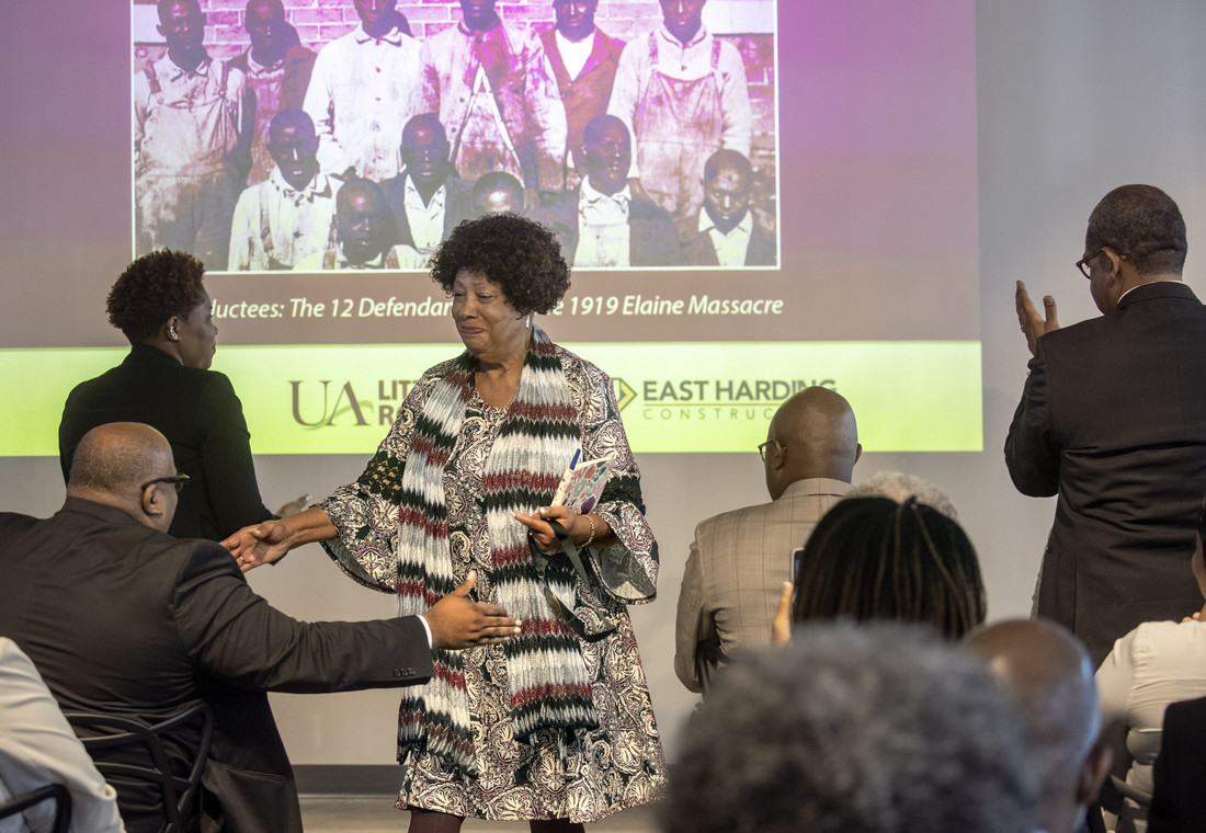 Sheila Walker thanks Dr. Brian Mitchell while being honored as a descendant of the Elaine 12. Photo by Ben Krain.