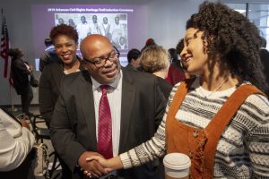 “This is a momentous occasion where we honor the lives and legacy of the Elaine 12 and the other victims of that dark moment in Arkansas’s history,” Hill said. “However, history teaches us that indeed we can learn from our past and together build a better society. We wouldn’t be here if not for the work of UA Little Rock and Brian Mitchell and the extraordinary work the university has done on behalf of the Elaine Massacre.”Following the ceremony, the new markers were unveiled on the north sidewalk of President Clinton Avenue between Cumberland Street and Rock Street. Second Presbyterian Church helped fund the markers with a $4,000 grant from the church’s Social Justice Advocacy Committee. East-Harding Construction has partnered with the university for the past 11 years to provide materials for the trail markers and install them.Little Rock Mayor and UA Little Rock Alumnus Frank Scott, who gave closing remarks, said we must learn from the mistakes of the past to ensure that events like the Elaine Massacre are never repeated.“We understand the Arkansas Civil Rights Heritage Trail acknowledges the past and commemorates trailblazers,” Scott said. “It honors our past but also acknowledges the horror. We thank our ancestors for what they have done. We acknowledge them, we respect them, but we give our firm commitment that it will never happen again.”The Arkansas Civil Rights Heritage Trail was founded by the UA Little Rock Anderson Institute on Race and Ethnicity in 2011 to acknowledge the sacrifices and achievements made by those who fought for racial and ethnic justice in Arkansas. Last year, the Arkansas Civil Rights Heritage Trail was named a part of the U.S. Civil Rights Trail.The trail begins in front of the Old State House Convention Center on Markham Street and will eventually extend to the William J. Clinton Presidential Center and Park. Each honoree’s name is commemorated with a 12-inch bronze marker on the trail and a biography on the trail’s website.
