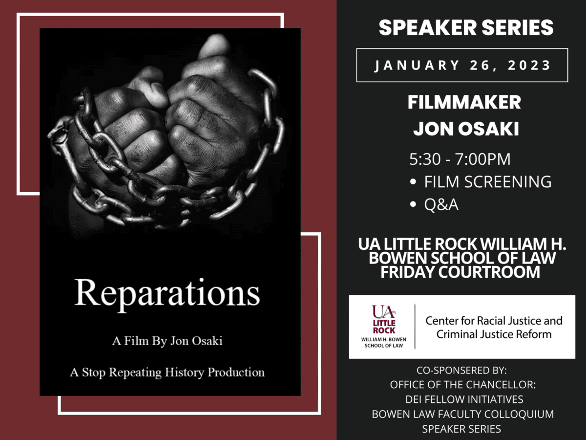“We are delighted to be welcoming documentary filmmaker Jon Osaki to UA Little Rock and the William H. Bowen School of Law to screen his timely recent documentary ‘Reparations,’” said andré douglas pond cummings, associate dean of faculty and Charles C. Baum Professor of Law. “As the movement to repair historical economic injury to Black Americans gains steam in the United States, we are enthusiastic to contribute to this conversation in Arkansas.”