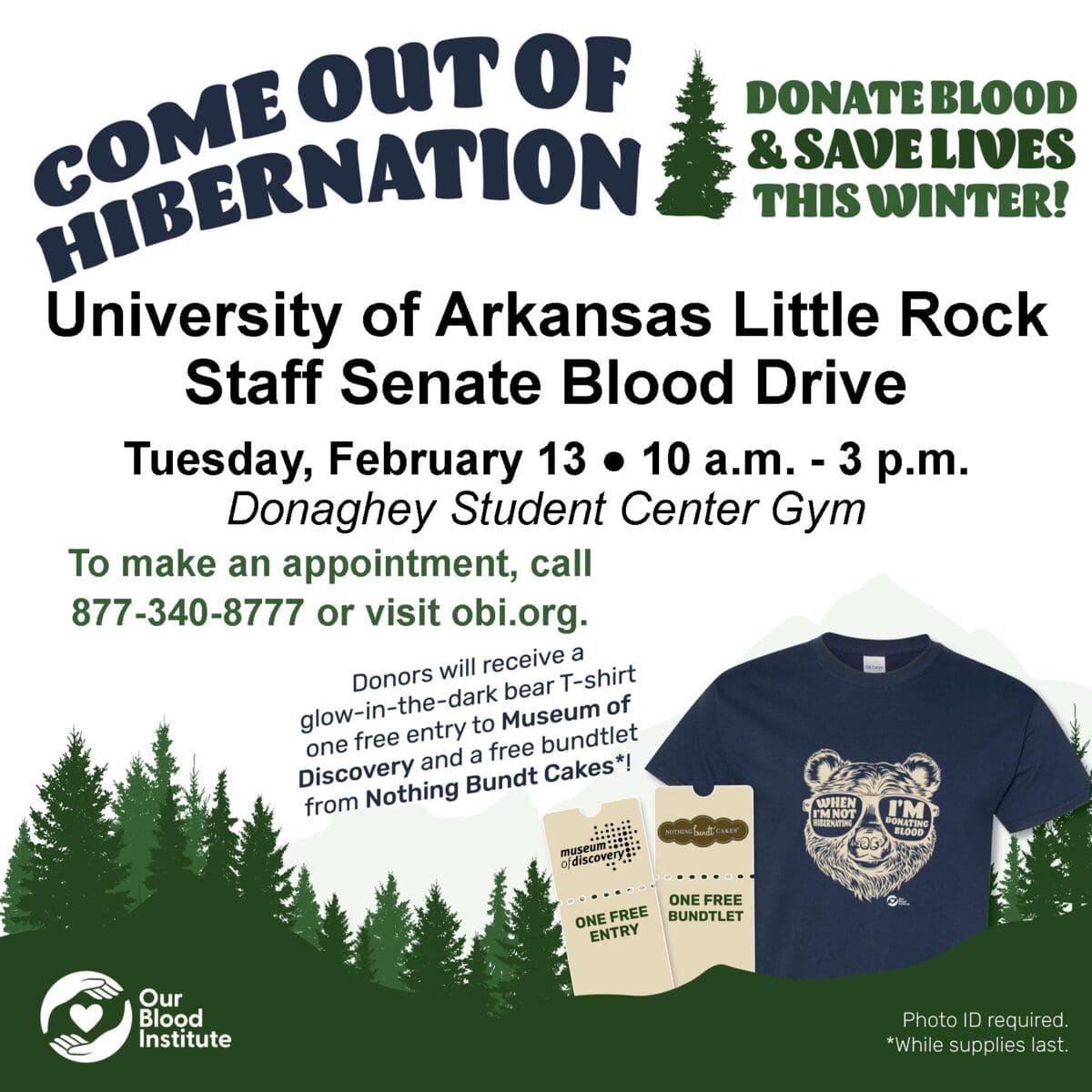The UA Little Rock Staff Senate will hold a blood drive from 10 a.m. to 3 p.m. Tuesday, Feb. 13, inside the Donaghey Student Center Fitness Center.