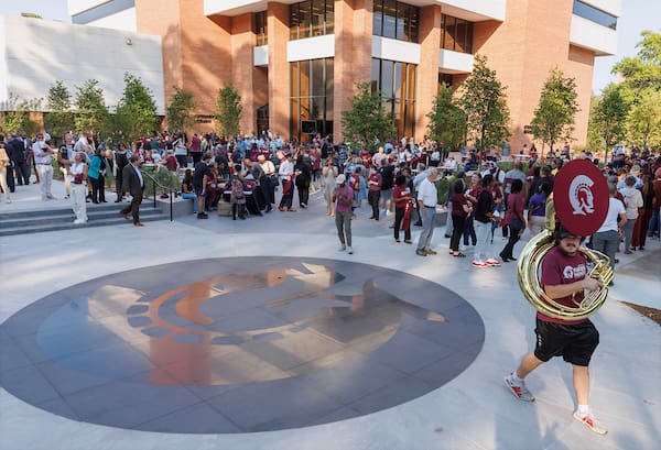 The Donaghey Stage is a key component of Trojan Way, which was recently transformed into a modern, engaging outdoor learning and gathering space. Trojan Way includes walkways with landscaping and lighting, multiple gardens and outdoor learning environments, and benches with built-in charging stations. UA Little Rock planted more than 250 trees along the more than 200,000 square-foot-project.