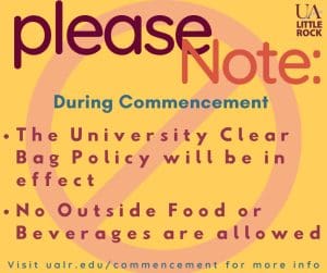 Don’t forget! Normal Jack Stephens policies, such as the Clear Bag and the No Outside Food or Drink policies, will be in effect for commencement next week. Visit ualr.edu/commencement for more information before the big day!
