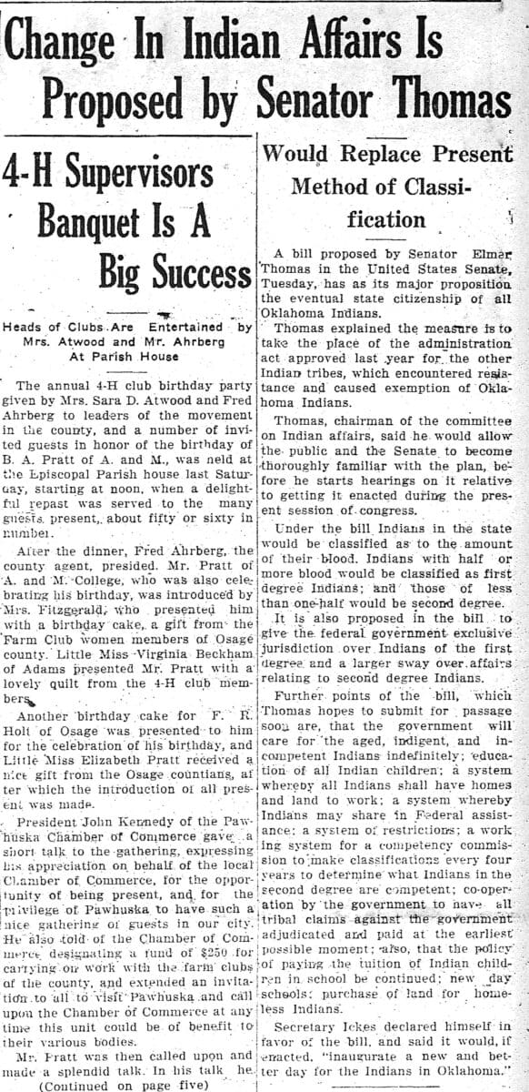 This 1935 article discusses Senator Elmer Thomas’ proposal of a bill that would lead to full state citizenship for all American Indians in Oklahoma. In his bill, which was created with the assistance of Representative Will Rogers, Thomas proposes a blood classification system, described as, “Indians with half or more blood would be classified as first degree Indians; and those of less than one-half would be second degree.” Furthermore, the proposed piece of legislation called for the United States government to have, “exclusive jurisdiction over Indians of the first degree and a larger sway over affairs relating to second degree Indians.” Other elements of the proposed bill included government assistance in education, caring for the elderly, and housing, and a request, “to have all tribal claims against the government adjudicated and paid at the earliest possible moment.”