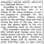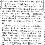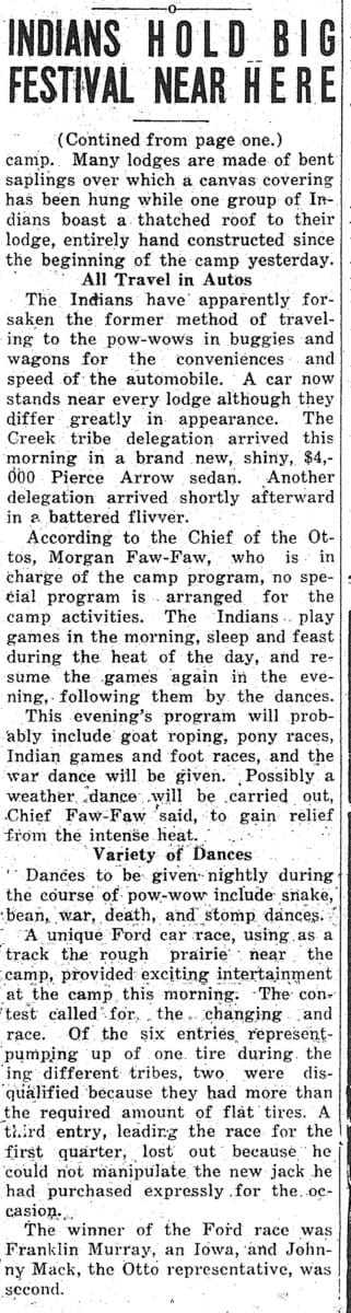 Many activities were to take place during the pow-wow, including, “goat roping, [a] barbeque, special Indian dances and other special features.” A variety of dances were held each night and a car race was even held on the morning of July 31. Iowa tribal member, Franklin Murray, came in first with Johnny Mack, a member of the Otoe tribe, following in a close second. The article noted with surprise the Indians’’ use of modern transportation. It states that, “Indians have apparently forsaken the former method of traveling to the pow-wows in buggies and wagons for the conveniences and speed of the automobile. A car now stands near every lodge.”