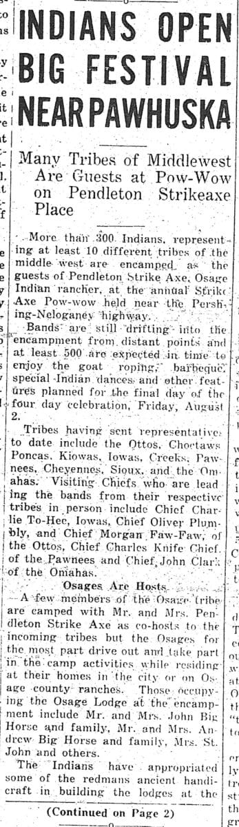 The Indian festival was hosted by Osage tribal member and rancher, Pendleton Strike Axe. The celebration was to span over a period of four days and hundreds of American Indians from over ten different tribes flooded the scene. Tribes represented in the festival included the Oteos, Choctaws, Poncas, Kiowas, Iowas, Creeks, Pawnees, Cheyennes, Sioux, and Omahas. Several tribal Chiefs also made the event to represent their tribes in person.