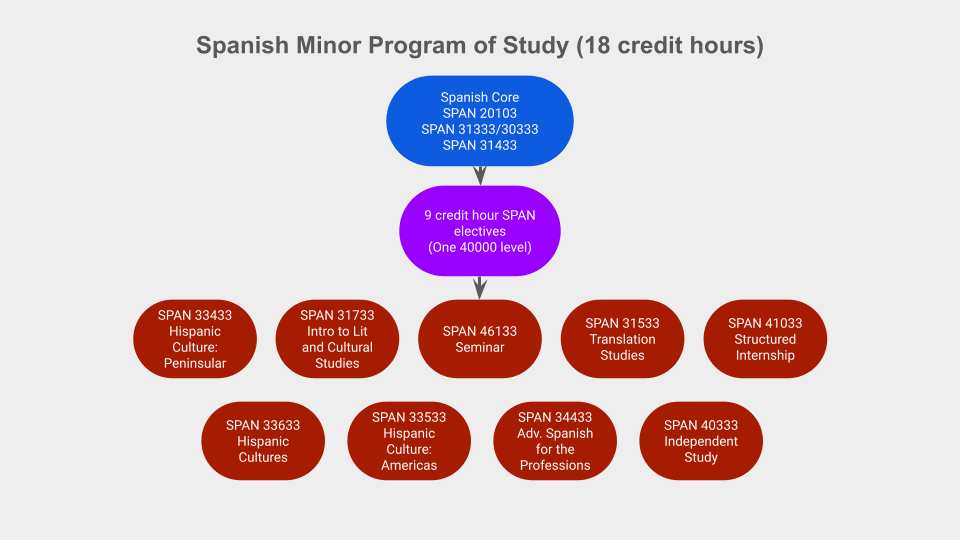 The minor in Spanish offers you the opportunity to develop your Spanish language skills and your cultural awareness so that you can use what you learn in your community and in your workplace. It consists of 18 credit hours, or approximately 6 courses. After students complete the Spanish Core Curriculum, students must take 9 credit hours of electives (shown above in red) and have at least 3 credit hours in a 40000 course.