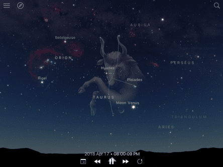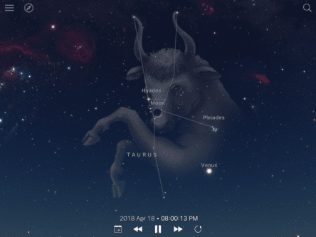 April 18 – The waxing crescent moon is now located amid the Hyades star cluster in the constellation of Taurus.