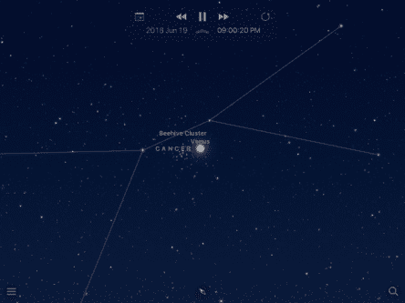 • June 19 – Look to the west during the early evening to see the planet Venus just skirting the northern edge of the Beehive Star Cluster (Messier 44). Use binoculars to see Venus nestled in among this glittering group of background stars.