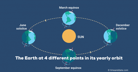Look back at the graphic again to the dates in March and September. Notice how on these two dates that neither hemisphere is either angled towards or away from the Sun and its rays are now shining down upon the equator, giving both hemispheres roughly equal amounts of both day and night. Here in the Northern Hemisphere, our temperatures tend to become milder compared to the extremes of winter and summer.