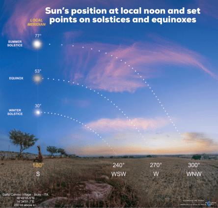 In a roughly 24-hour span of time, the Earth spins once upon its tilted axis. It spins from west to east but the visual illusion this creates is that the Sun, stars, moon, and planets appear to rise in the east and set in the west. As the Sun traces its daily path across the sky we see it increase its altitude from sunrise before reaching its highest point at local noon, and then decreasing in altitude as it heads into afternoon and evening. But there is also an apparent seasonal change in the Sun’s altitude over the course of the year as well, with the Sun appearing higher up in the sky during summer and then becoming lower in the sky during winter. This change in altitude is all due to the Earth’s tilted axis and its ever-changing orientation to the Sun as we make our annual trek around it. The seasonal change in altitude also means that, for most of the year, the Sun does not rise due east or set due west. More on that in just a minute. It is this varying altitude of the Sun and its rise and set points along the horizon in relation to the cardinal points on the compass, that people in the ancient world paid so much attention to in order to create calendars and forecast the seasons.