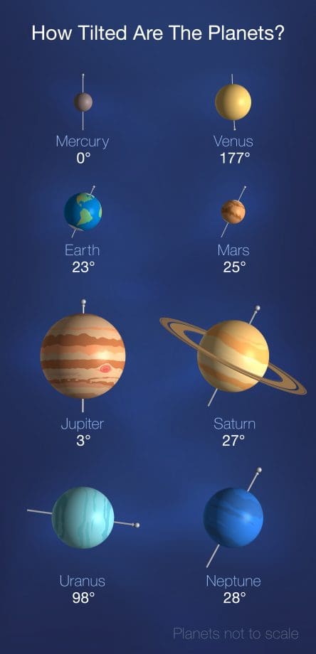 Surrounding the infant Sun was a giant disc of leftover gas and dust. From out of this material would condense the planets, dwarf planets, moons, asteroids, and comets that make up our solar system family. But the Sun’s powerful gravitational influence created instability in the disc and this turmoil allowed for the shifting orbits of planets and the collisions of young planetismals and protoplanets (objects that were theoretically on their way to becoming full fledged planets). This was a violent time in our solar system’s history and around 4.5 billion years ago, a Mars-sized object that astronomers have named Theia, collided with the infant Earth. This collision resulted in Theia and the Earth melding together, with the exception of some material that got flung out into space and which would eventually come together to form our moon. As a result of this collision, the Earth got knocked off its perpendicular rotational axis by about 23.5 degrees. The stabilizing effect of the moon’s gravity has held it mostly that way ever since.